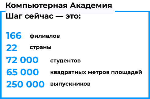 Сейчас в академии «ШАГ» 2900 сотрудников, 50 000 выпускников, 60 000 м² площадей — это крупнейшее учебное заведение Европы